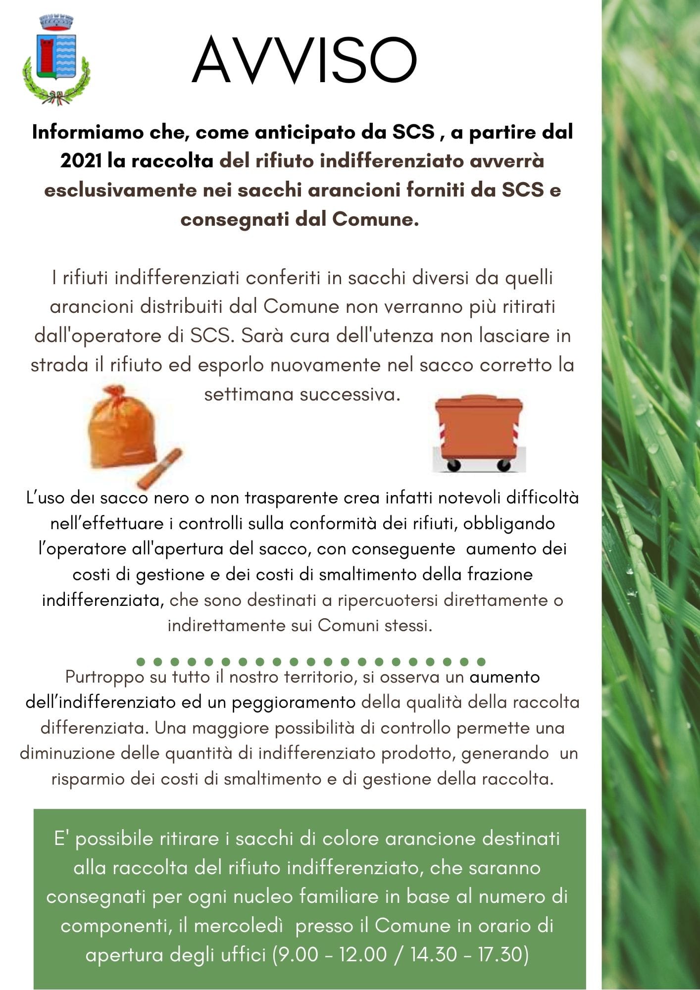 Inoltre informiamo che, come anticipato da SCS, a partire da gennaio 2021 la raccolta del rifiuto indifferenziato avverrà esclusivamente nei sacchi arancioni trasparenti forniti da SCS e distribuiti dal Comune.