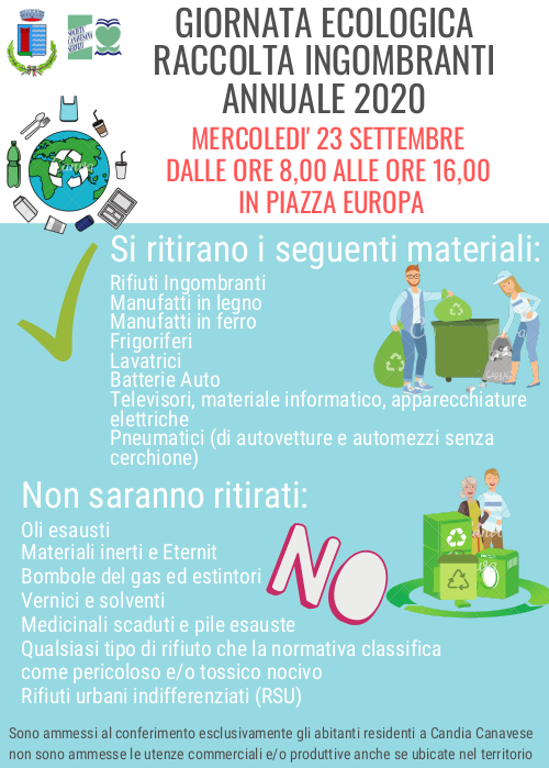 Lo stato di emergenza a marzo ha impedito lo svolgersi della giornata ecologica. Purtroppo non è stato possibile riorganizzare tale giornata al sabato ma la Società Canavesana Servizi, si è resa disponibile a ricalendarizzare la raccolta ingombranti nel nostro Comune, il giorno mercoledì 23 settembre.