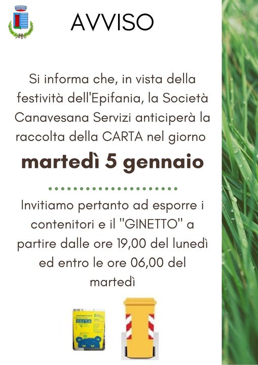 Si informa che, in vista della festività dell'Epifania, la Società Canavesana Servizi anticiperà la raccolta della CARTA nel giorno di martedì 5 gennaio.