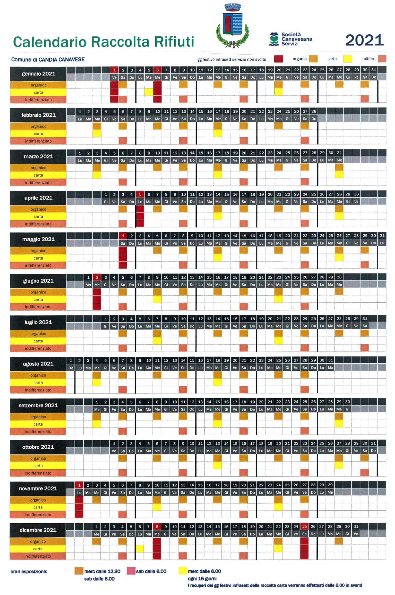 CALENDARIO 2021 della raccolta rifiuti a Candia da parte della Società Canavesana Servizi.