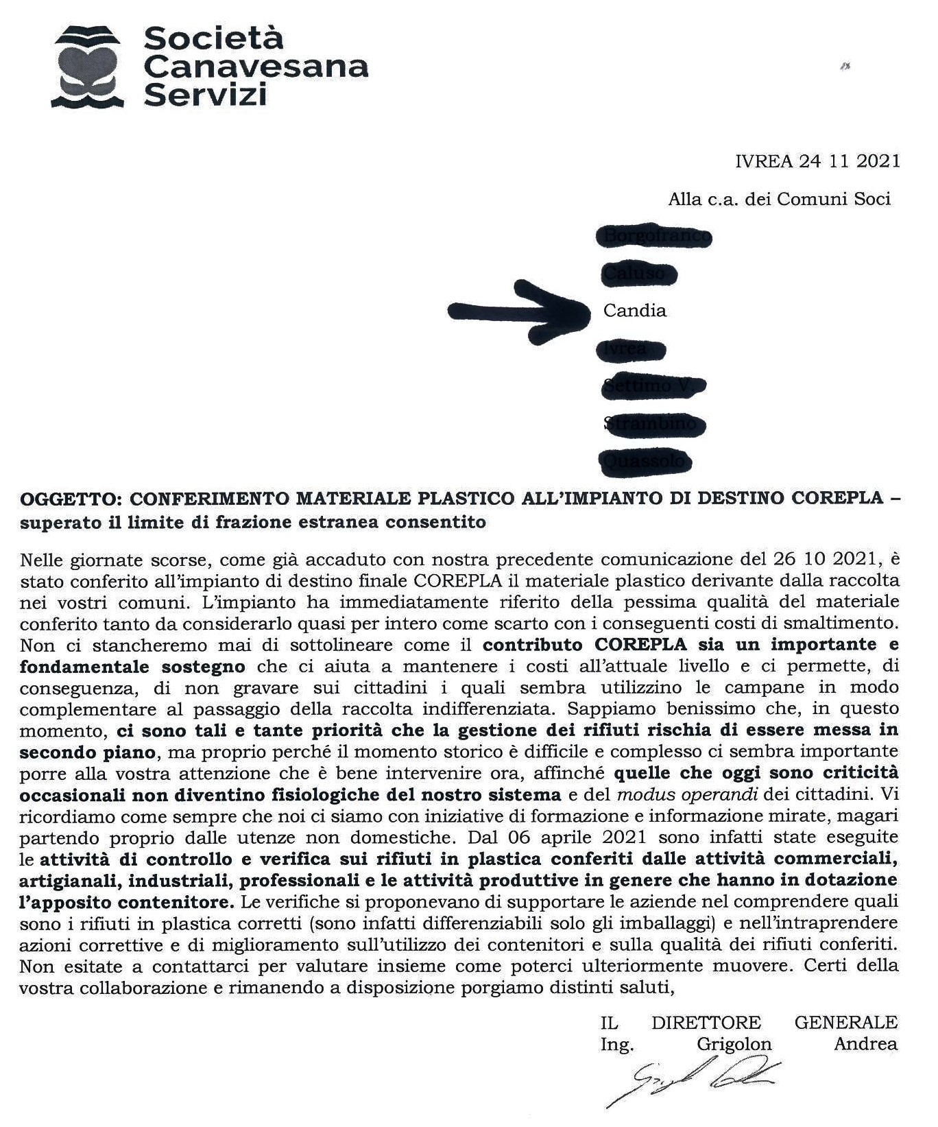 S.C.S. ha inviato al Comune di Candia - e ad altri sei Comuni su 57 del consorzio - una lettera nella quale comunica che nelle campane della raccolta plastica abbiamo superato il limite consentito di presenza "materiale NON conforme".