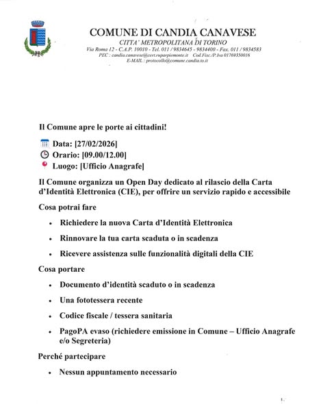 In vista di tale scadenza, abbiamo ritenuto di organizzare un OPEN DAY ( venerdì 27 febbraio ) dedicato ESCLUSIVAMENTE all'emissione della C.I.E.