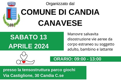 La nostra Amministrazione in collaborazione con CARDIO DAE LIFE, organizza per sabato 13 aprile presso la tensostruttura del parco giochi di via Castiglione, un corso libero a tutti, per la formazione all'uso del defibrillatore.