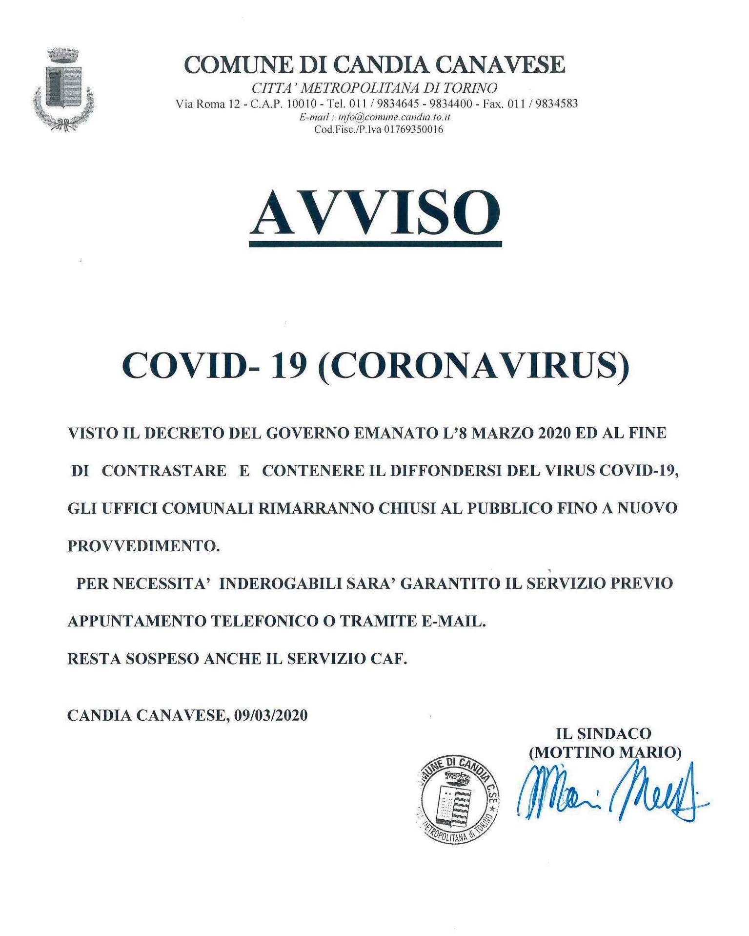 Visto il decreto del governo emanato l'8 Marzo 2020 ed al fine di contrastare e contenere il diffondersi del coronavirus COVID-19, gli uffici comunali rimarranno chiusi al pubblico fino a nuovo provvedimento.
