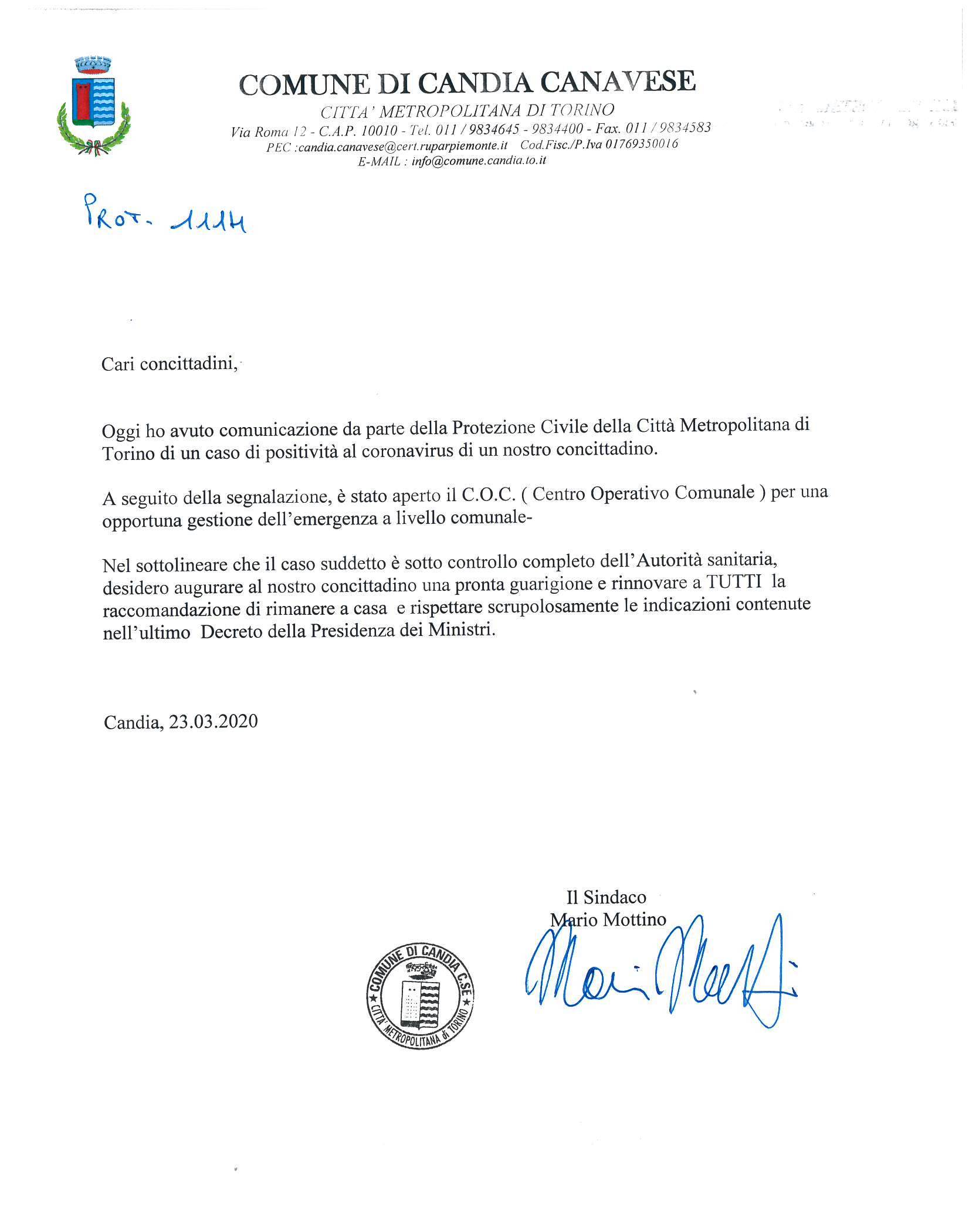 Cari concittadini, oggi ho avuto comunicazione da parte della Protezione Civile della Città Metropolitana di Torino di un caso di positività al coronavirus di un nostro concittadino. Il caso suddetto è sotto il completo controllo dell' Autorità Sanitaria.