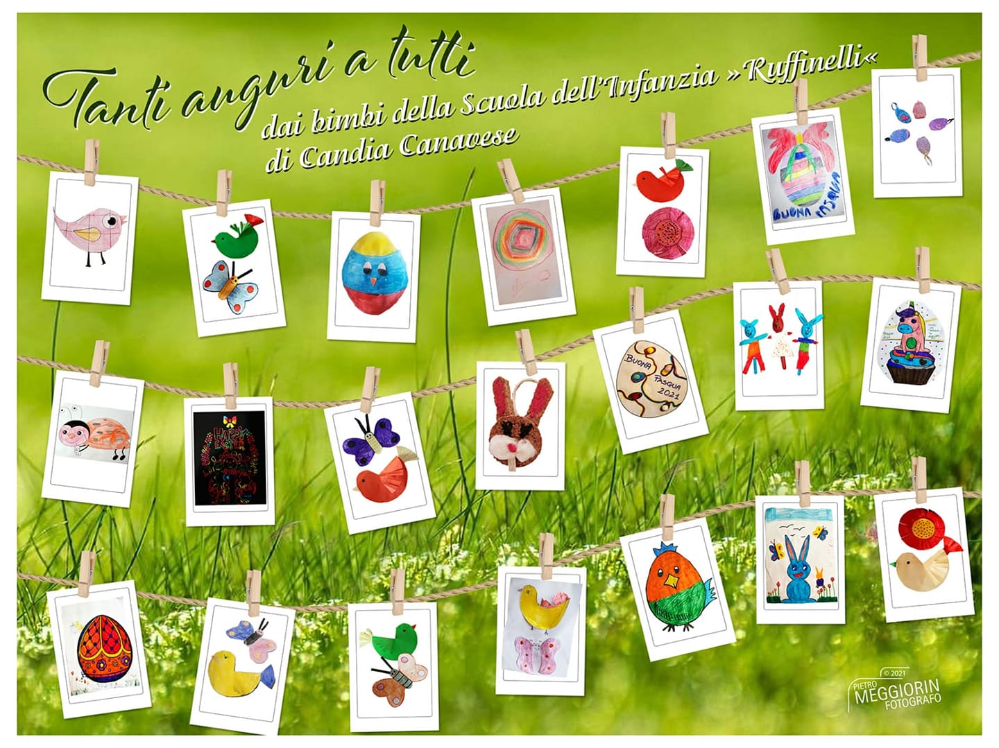 I bambini della scuola dell' infanzia con i loro disegni e, assieme alle educatrici, augurano Buona Pasqua a tutti i Candiesi.