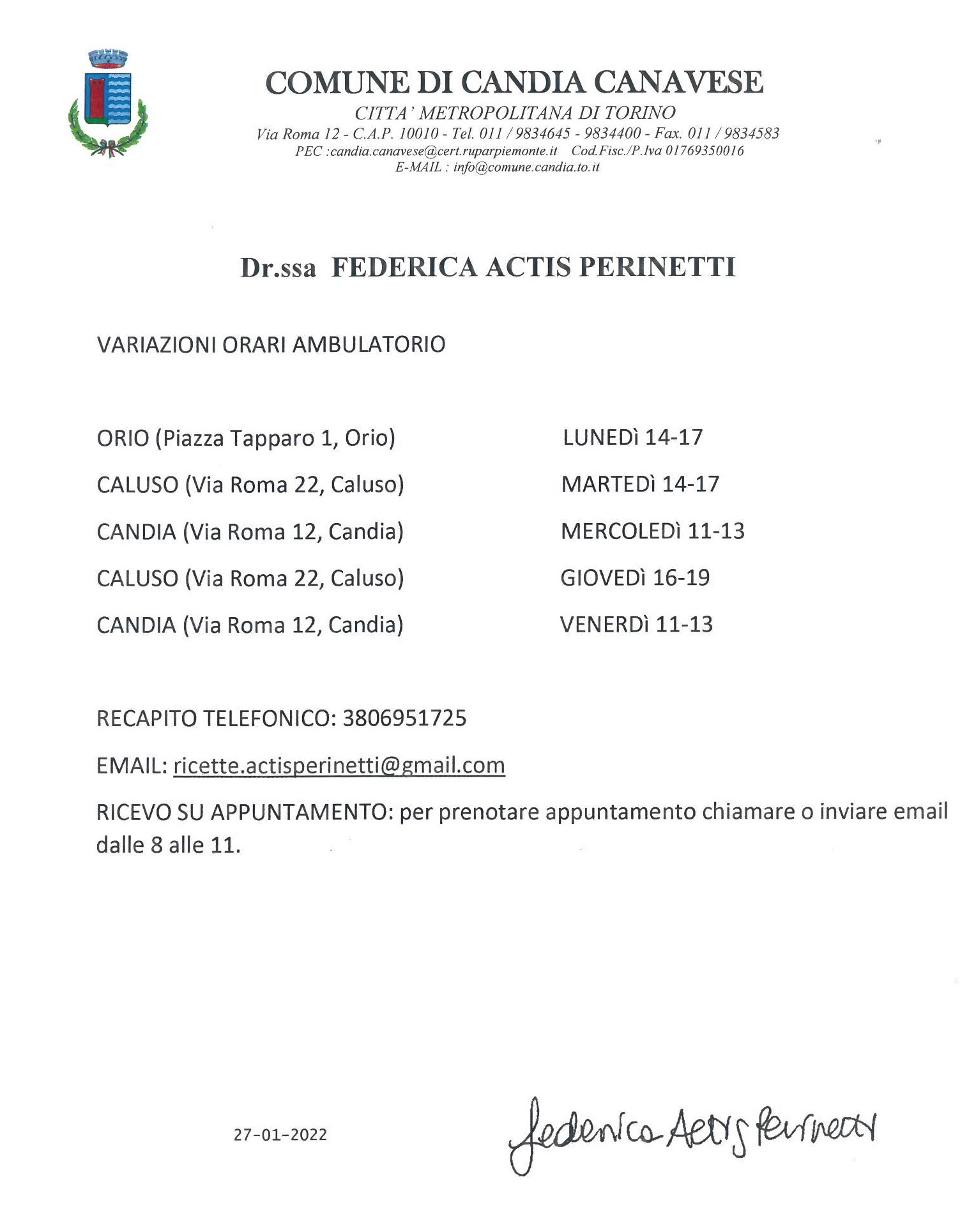Variazione orari dell'ambulatorio medico della Dr.ssa Actis Perinetti