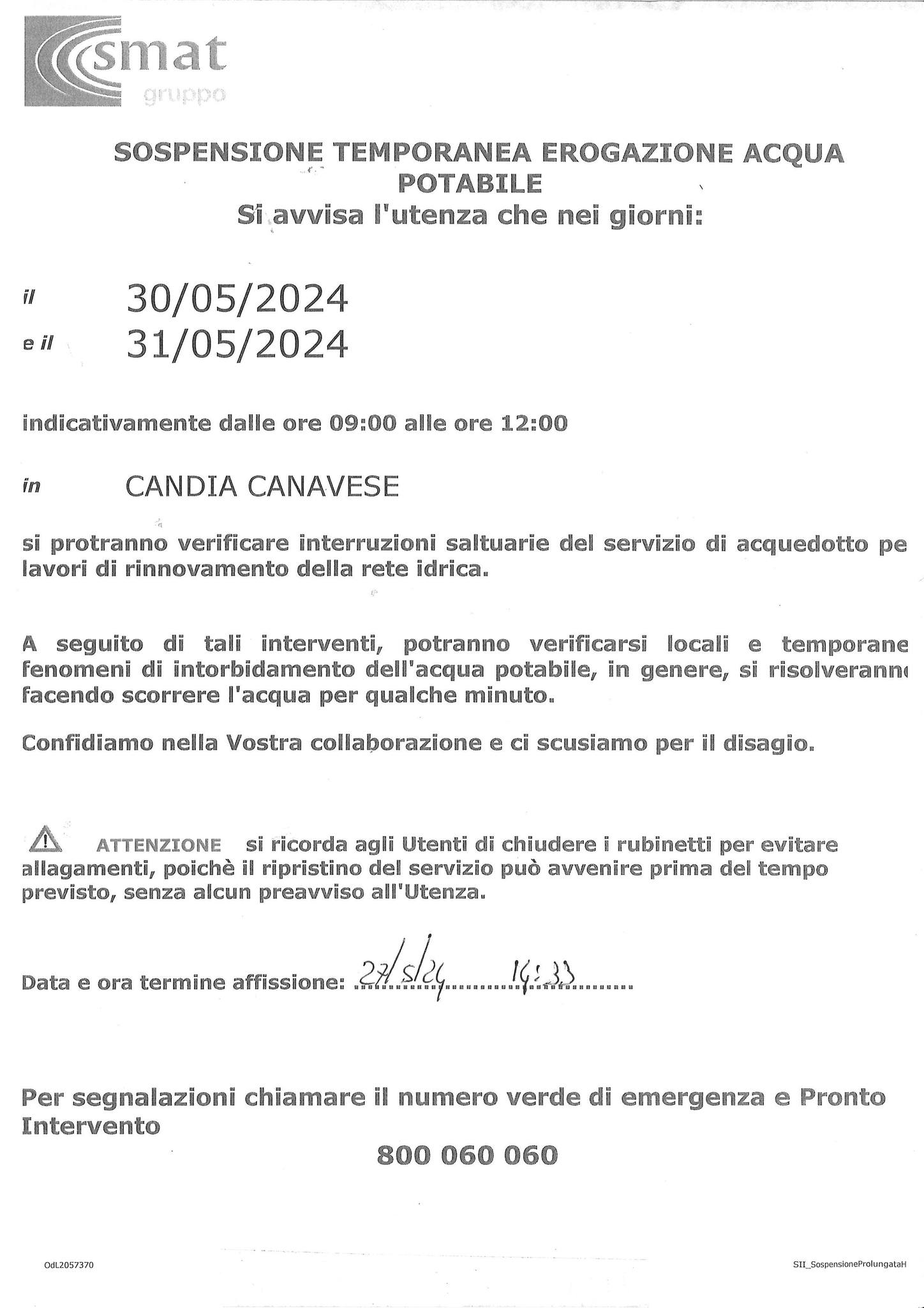 La SMAT comunica - per lavori di rinnovamento della rete idrica - la sospensione temporanea di erogazione acqua potabile nei giorni: 30 e 31 Maggio 2024 dalle ore 9.00 alle 12.00